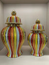 Enerji dolu çizgili tasarımıyla dikkat çeken bu 2’li seramik kavanoz seti, ev dekorasyonuna renkli ve modern bir dokunuş kazandırıyor. Altın detaylı kapaklarıyla lüksü yansıtan bu kavanozlar, yaşam alanlarınıza neşe ve şıklığı bir arada getiriyor.