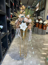 El yapımı yapay çiçek aranjmanlarımız, gold detaylı modern metal ayaklı vazolarla buluştu. Otel, salon, giriş alanı, mağaza veya ofis dekorasyonu için mükemmel bir tercih.
